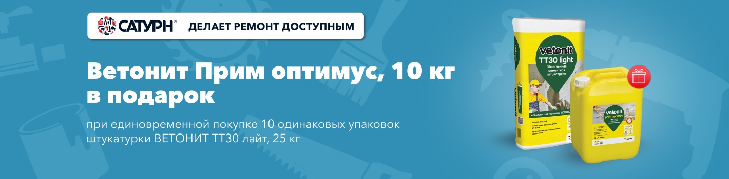 При единовременной покупке 10 одинаковых упаковок штукатурки ВЕТОНИТ ТТ30 лайт, 25 кг, Вы получаете 1 упаковку грунтовки ВЕТОНИТ Прим оптимус, 10 кг в подарок!