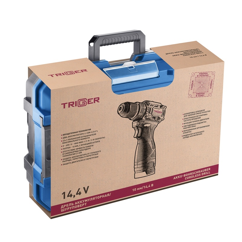 Дрель-шуруповерт Trigger 20130, бесщеточная, 14,4V, 10 мм, 48 Нм, 2 аккумулятора Li-ion (2Ач), кейс в Челябинске