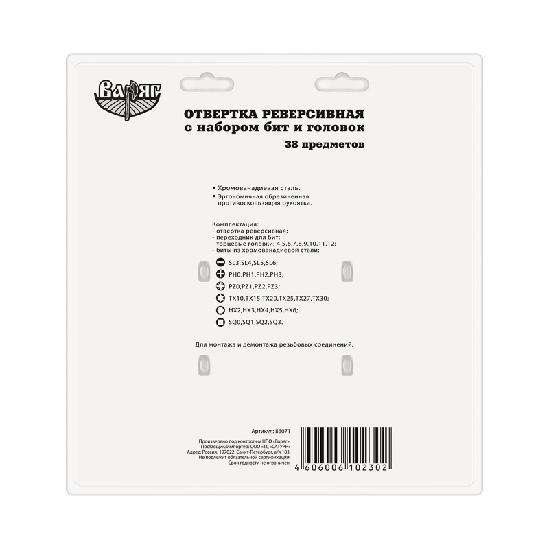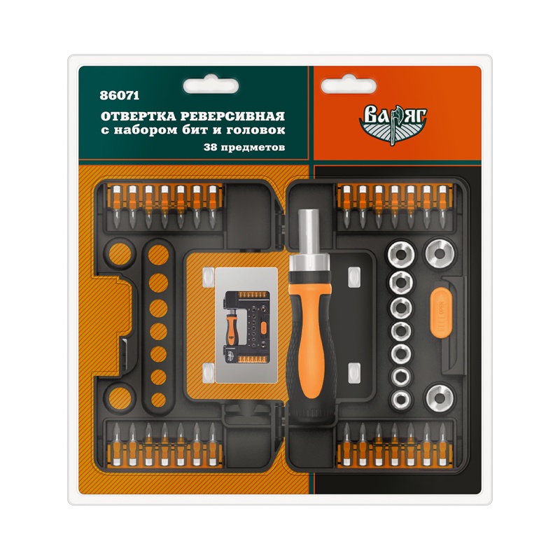 Отвертка реверсивная Варяг 86071 с набором бит и головок (38 предметов)